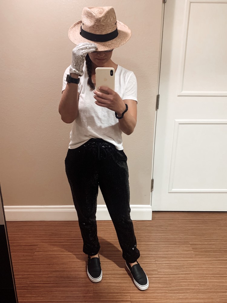 We flew out to Cabo the day after our wedding, which also happened to be Halloween. Naturally, my costume choice was based on comfort since we would be traveling most of the day. I got these killer sequined joggers from Rent the Runway (<— use that link for a discount off your first month of membership!) and paired it with a white tee and a sequenced glove a la Michael Jackson style.