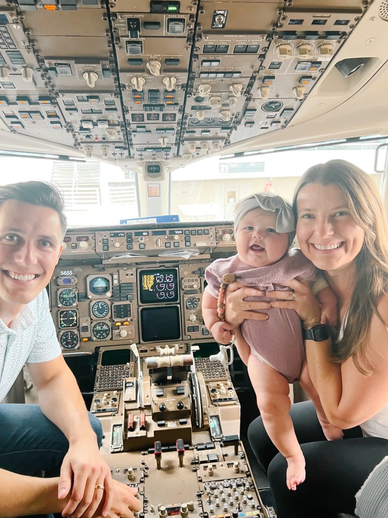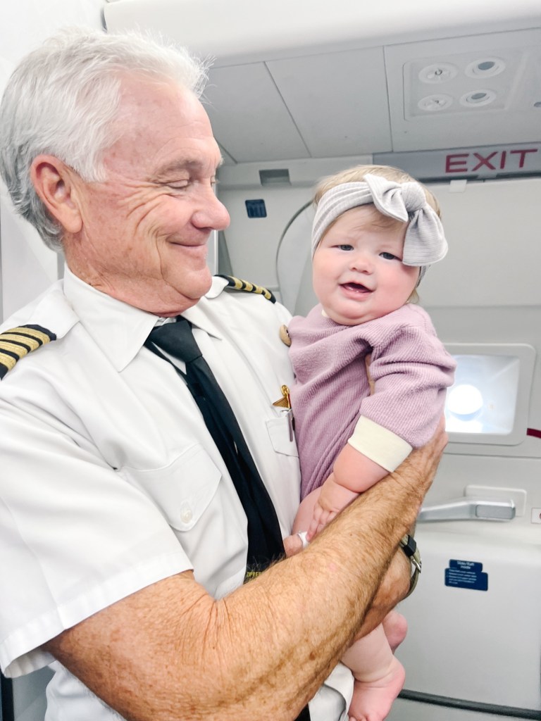 Everyone always asks about her ears popping on take off and landing. There’s only one time that she seemed bothered by it and I think it was more to do with a cold she was fighting than anything else. We like to have a bottle of formula prepared and a pacifier close by. The sucking/swallowing helps to adjust the pressure in their inner ears as the elevation changes. Right before take off or as we begin our descent – we offer her the milk or pacifier and she usually takes one and is fine.
